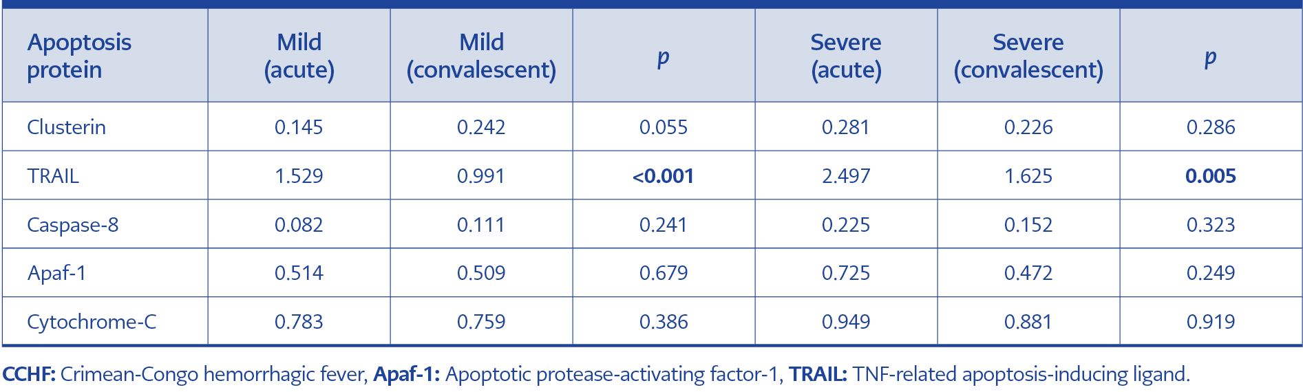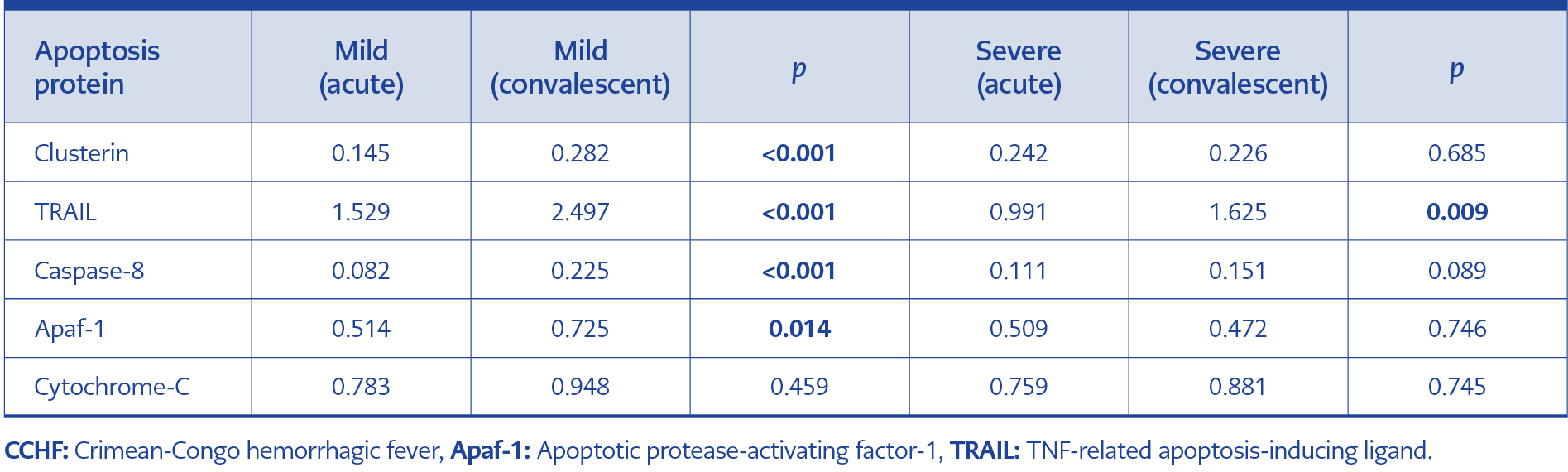 Apoptosis-related proteins such as tumor necrosis factor-related apoptosis-inducing ligand (TRAIL), caspase-8, cytochrome C, apoptotic protease-activating factor 1 (Apaf-1), and clusterin are involved in both intrinsic and extrinsic pathways of cell death. Clusterin, in particular, exists in two forms: secretory and nuclear. Evaluating these biomarkers may provide early insight into disease severity and improve clinical decision-making. However, current knowledge on the effect of apoptosis on the prognosis of CCHF and how these biomarkers are affected according to the stages and severity of the disease remains limited.