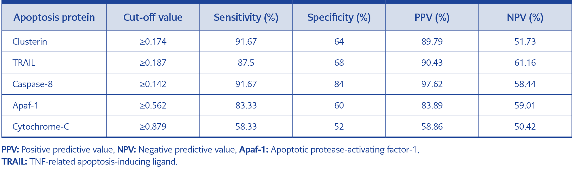 Cut-off values for apoptosis proteins indicating disease severity are shown in Table 3. Sensitivity and specificity values were as follows: clusterin, 91.67% sensitivity and 64% specificity; TRAIL, 87.5% sensitivity and 68% specificity; caspase-8, 91.67% sensitivity and 84% specificity; Apaf-1, 83.33% sensitivity and 60% specificity; and cytochrome C, 58.33% sensitivity and 52% specificity. Positive and negative predictive values are also detailed in Table 3.