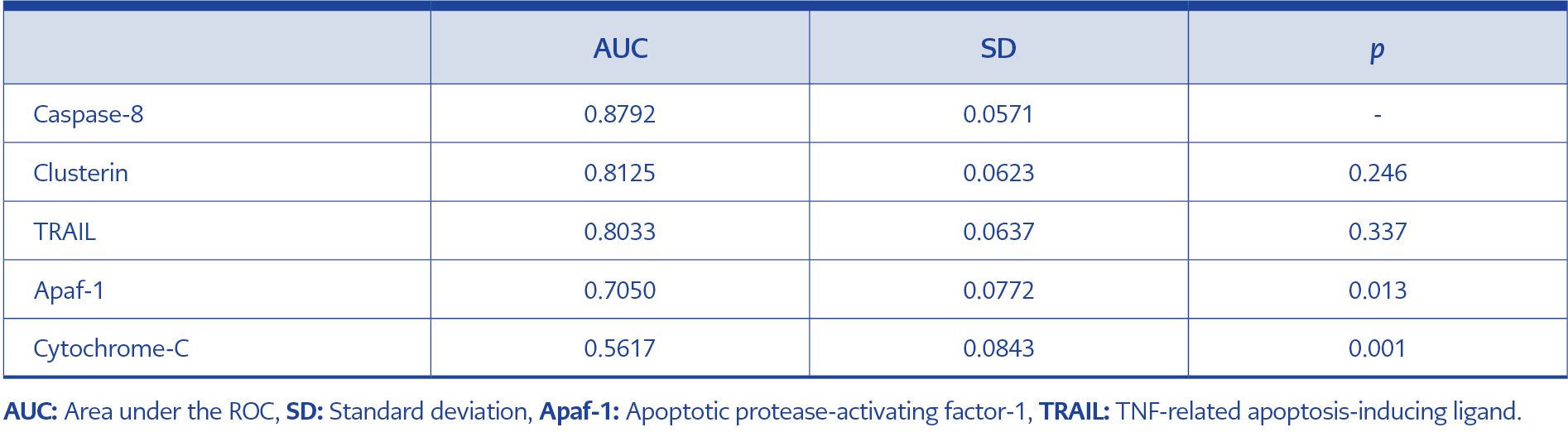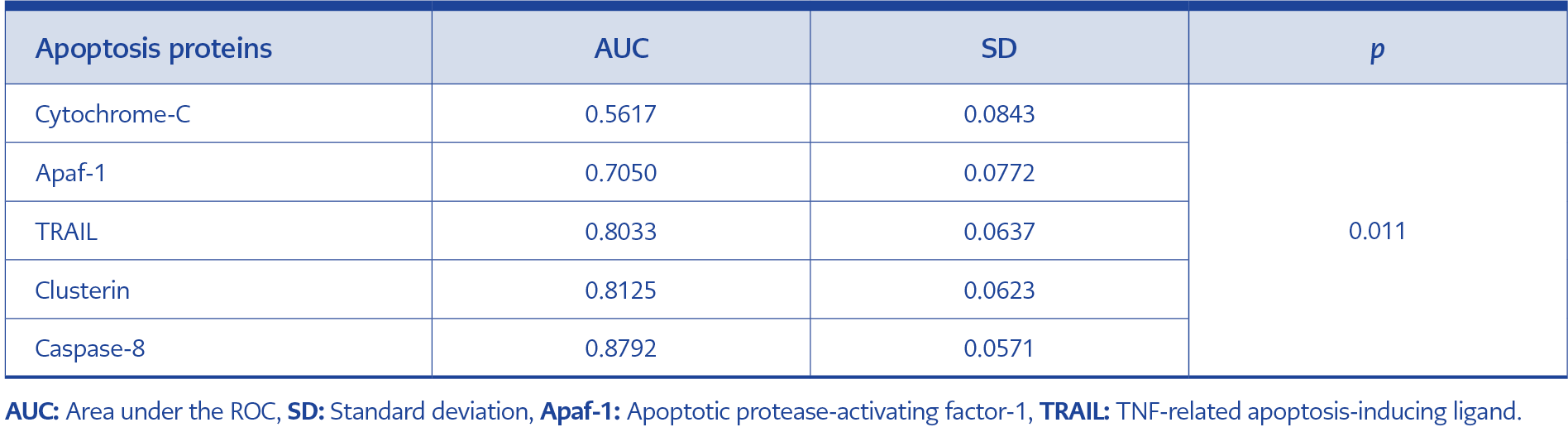 When caspase-8, the marker with the highest AUC, was compared with the other apoptosis proteins, no significant difference was found between its AUC and that of clusterin or TRAIL. However, Apaf-1 and cytochrome C had significantly smaller AUCs compared to caspase-8 (Table 5; Figures 1–5).