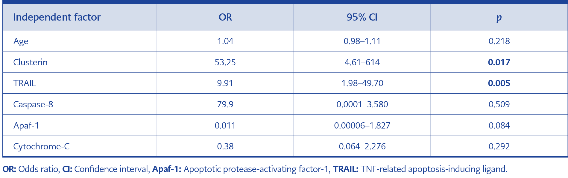 Multivariate regression analysis showed that only TRAIL (p=0.005) and clusterin (p=0.017) remained independent predictors of severity. Although older age was associated with severe disease in univariate analysis, it did not remain statistically significant in the logistic regression model (Table 6).