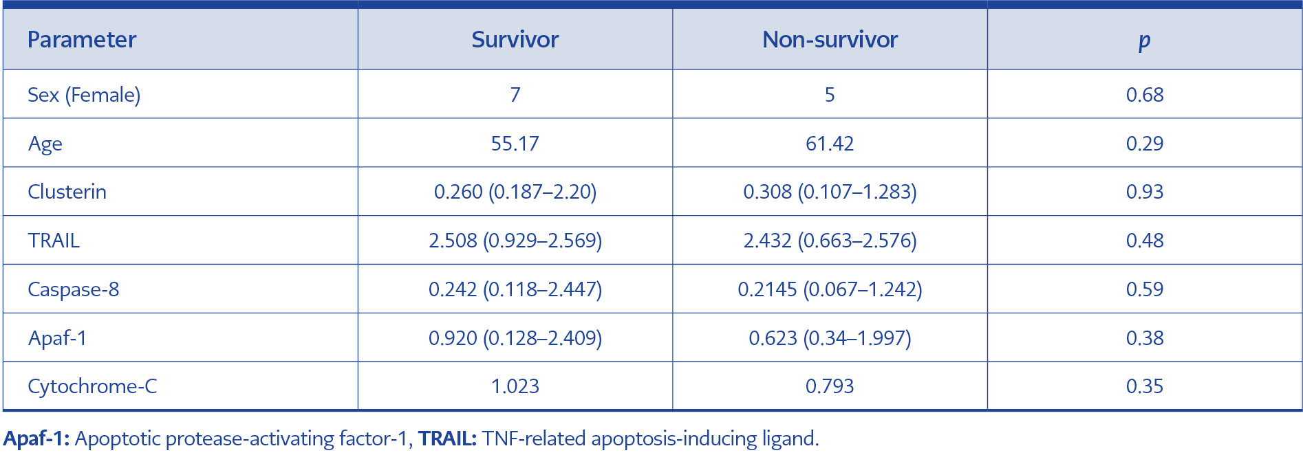Finally, the levels of apoptosis proteins during the acute phase were compared between surviving and deceased patients in the severe group. No significant differences were found between these two subgroups (Table 7).