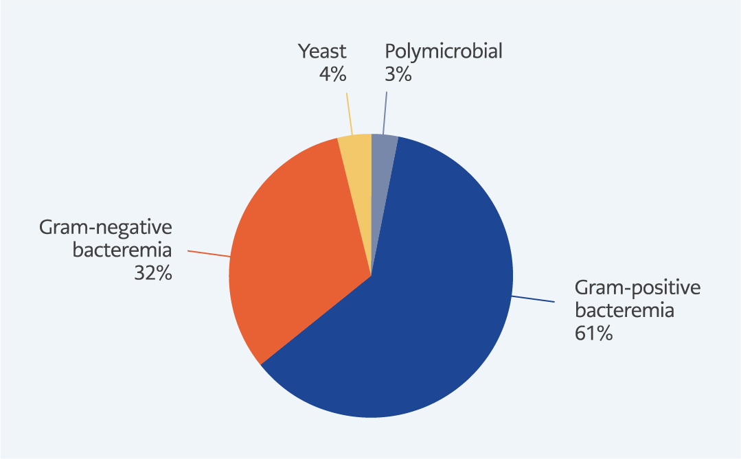 • Gram-positive bacteria — particularly coagulase-negative staphylococci — remain the leading causes of bacteremia in patients with hematological malignancies, though their incidence is declining.