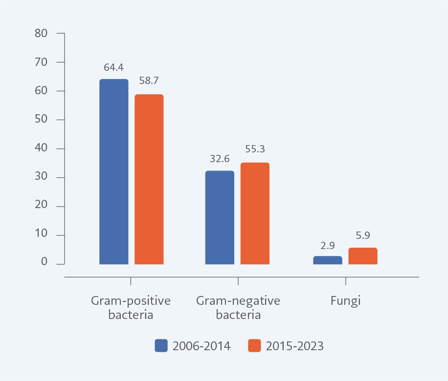 The study period was divided into two intervals: 2006–2014 and 2015–2023. A significant reduction in Gram-positive infections was observed in the second period (64.4% vs. 58.7%, p=0.007), primarily due to a decrease in CoNS (49.6% vs. 42.7%, p<0.001). Yeast infections increased significantly in the second period (2.9% vs. 5.9%, p<0.001). The rate of Gram-negative infections rose slightly, but this increase was not statistically significant in the second period (32.6% vs. 35.3%, p=0.244) (Figure 2).