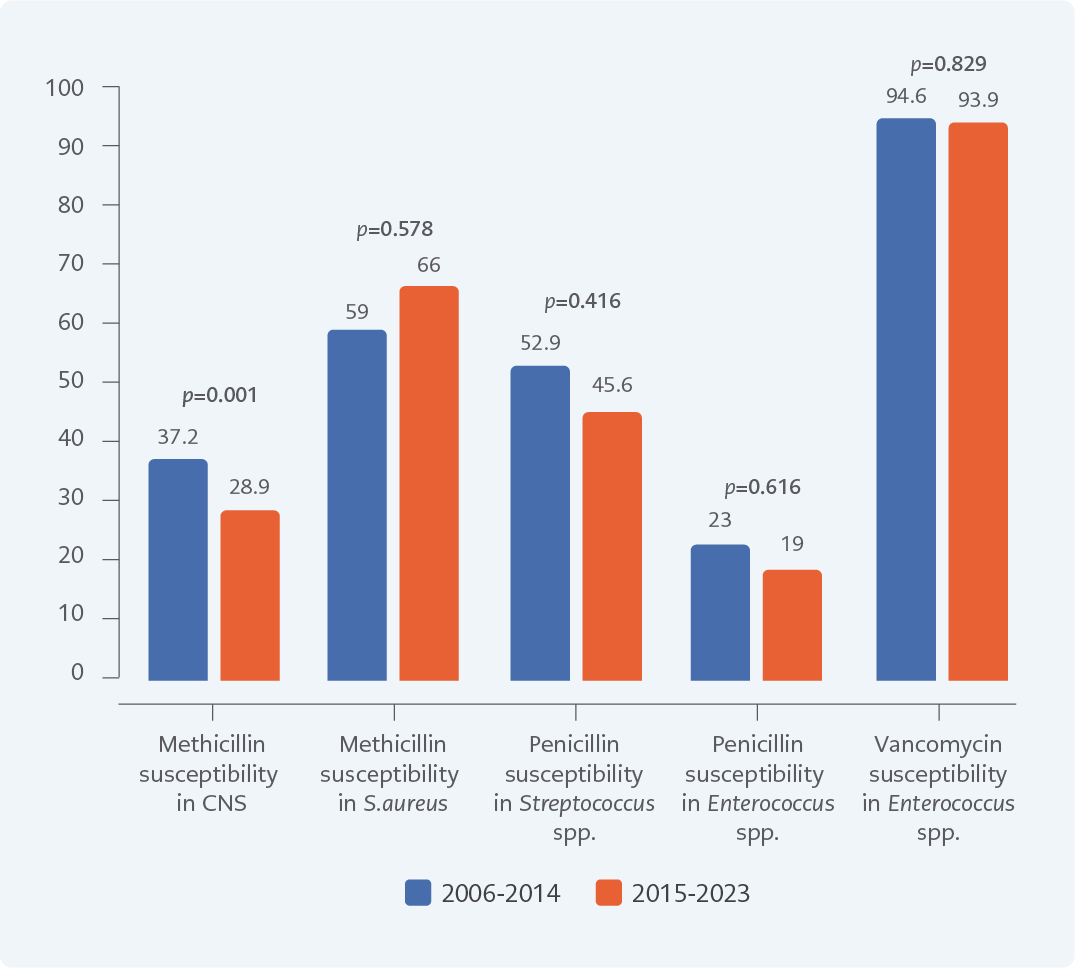 • Resistance patterns among Gram-positive organisms remained relatively stable; however, methicillin susceptibility among CoNS showed a notable decline.