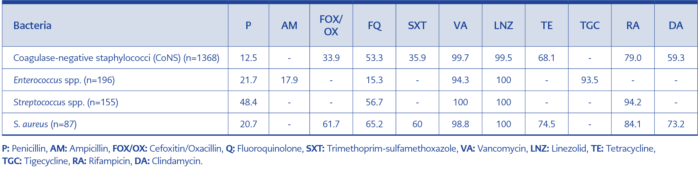 Table 2. Antimicrobial susceptibility rates of Gram-positive bacteria (%).