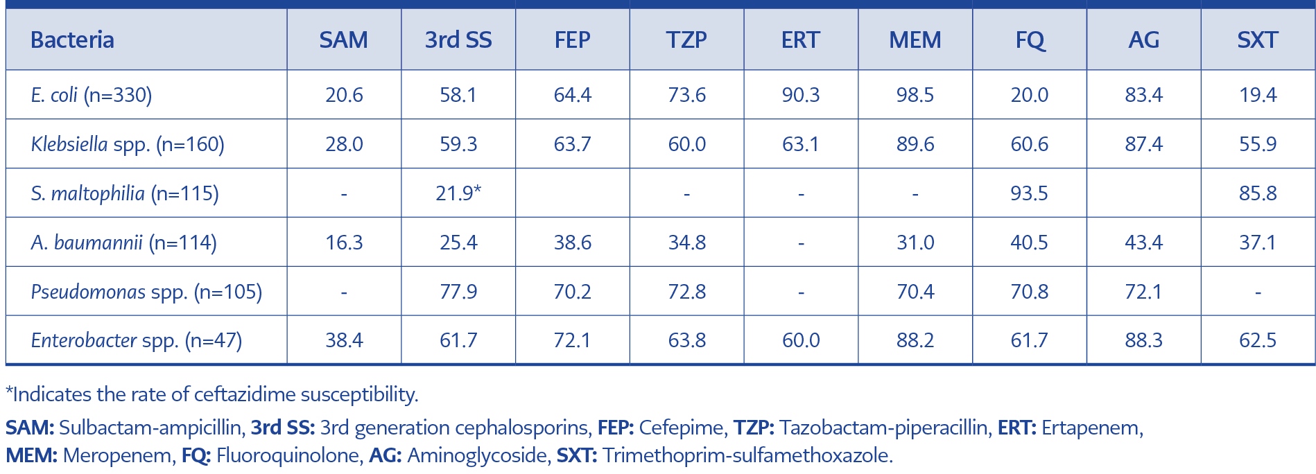 Table 3. Antimicrobial susceptibility rates of Gram-negative bacteria (%).