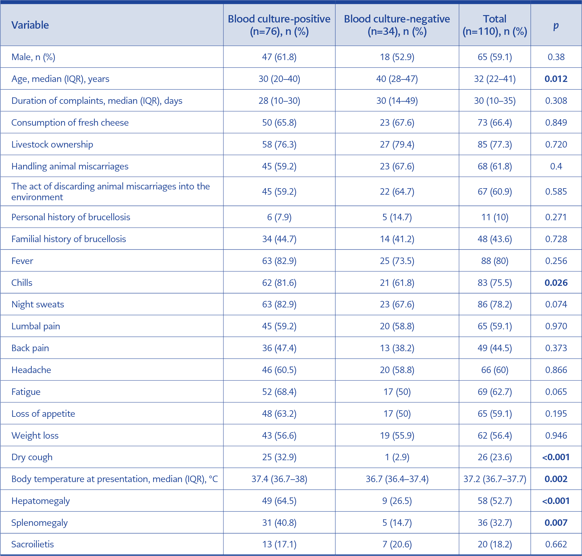 A total of 110 patients diagnosed with brucellosis were included in the study. Blood cultures were positive for Brucella spp. in 76 patients (69%). Demographic, clinical, and laboratory findings were compared between blood culture-positive and blood culture-negative groups (Tables 1 and 2).