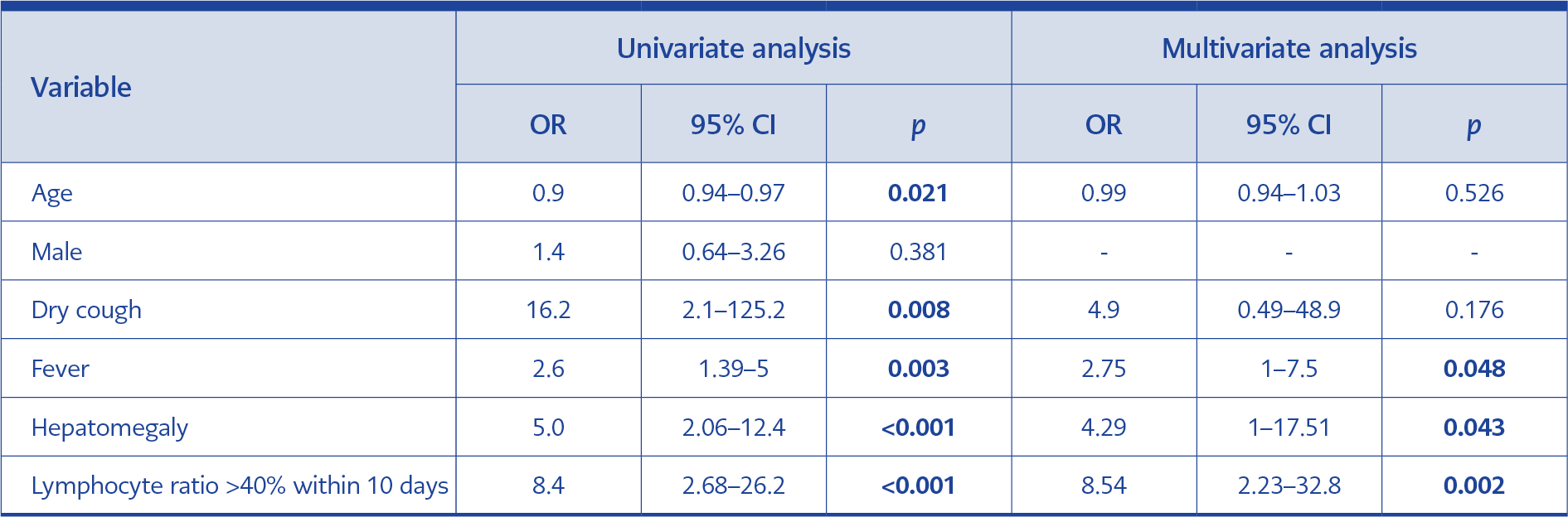 Univariate logistic regression analysis identified younger age, dry cough, high body temperature, hepatomegaly, and lymphocytosis as factors significantly associated with blood culture positivity. In the multivariate analysis, high body temperature at admission (OR 2.752; p=0.048), hepatomegaly (OR 4.288; p=0.043), and lymphocytosis (OR 8.544; p=0.002) remained independent predictors of bacteremia. Dry cough did not retain statistical significance in the multivariate model.