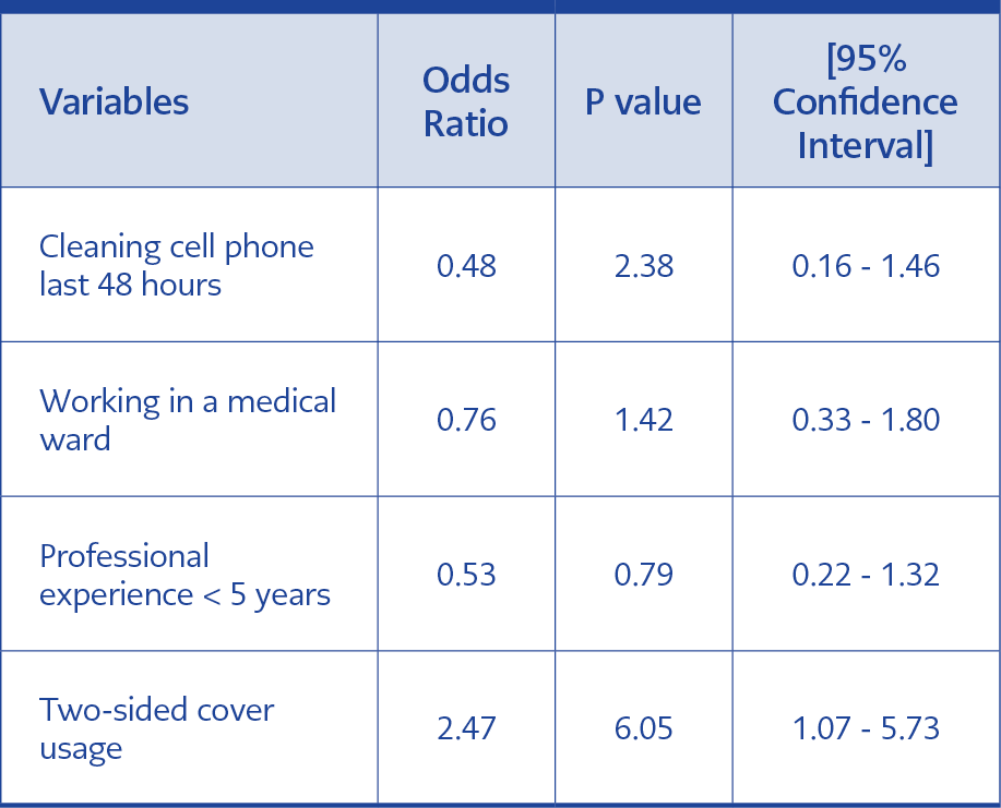All 631 cell phones investigated were contaminated with bacteria; forty-four of which were pathogenic microorganisms (Table 2) and the rest were skin flora bacteria. Drug resistance was not detected among pathogenic bacteria. Table 3 shows the variables and their association with pathogenic bacteria contamination. As determined by univariate analysis, using flip cover (P = 0.022), a professional experience of fewer than five years (P = 0.049), having cleaned the phone within the last 48 hours (P = 0.030), and working in a medical ward (P = 0.022) were significantly associated with pathogen contamination on the devices. Pathogen contamination on smartphones (7.7%) seemed to be higher than on mobile phones (5.2%). However, this difference was not statistically significant (P = 0.263). Multivariate analysis (Table 4) with logistic regression revealed that using flip cover (Figure 1) is the only factor associated with pathogen contamination on cell phones (OR:2.47; 95%CI:1.07-5.73; P=0.035) .