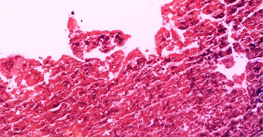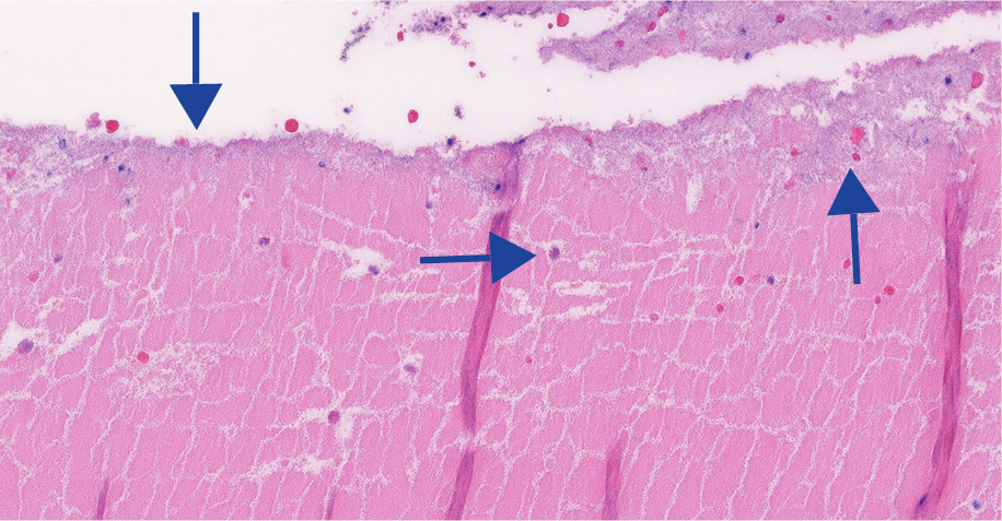 Figure 1a. Small part of fibrinous mass containing sparse erythrocytes. Faint basophilic hue (arrow) reflecting bacterial colonization is present in the fibrinous exudate; H&Ex26.