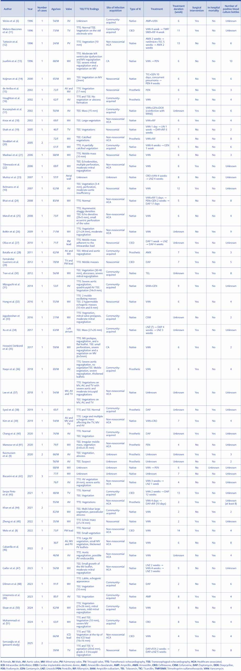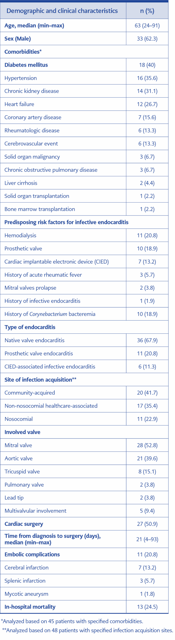 Table 2. Demographic and clinical characteristics of infective endocarditis cases caused by Corynebacterium striatum (n=53)