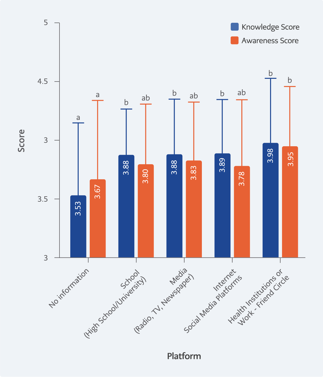 As shown in Figure 1, participants who obtained information from health institutions or through friends and colleagues had the highest awareness scores, whereas those without access to information had the lowest scores.
