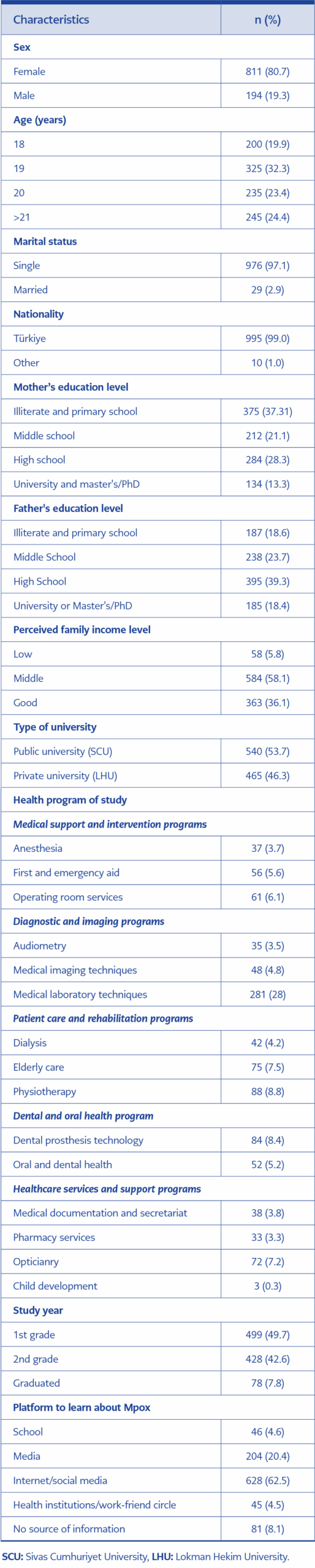 The sociodemographic characteristics of the 1005 participants are presented in Table 1. As shown in Table 1, the majority of participants were women (80.7%) and citizens of Türkiye (99%). More than half of the participants (53.73%) were enrolled in a public university, while 46.27% were studying at a private university or had graduated from such institutions. Nearly half of the participants (49.65%) were first-year students, 42.59% were in their second year, and 7.76% were graduates. Among the study programs, the highest participation was among students in the Medical Laboratory Techniques Program (27.96%).