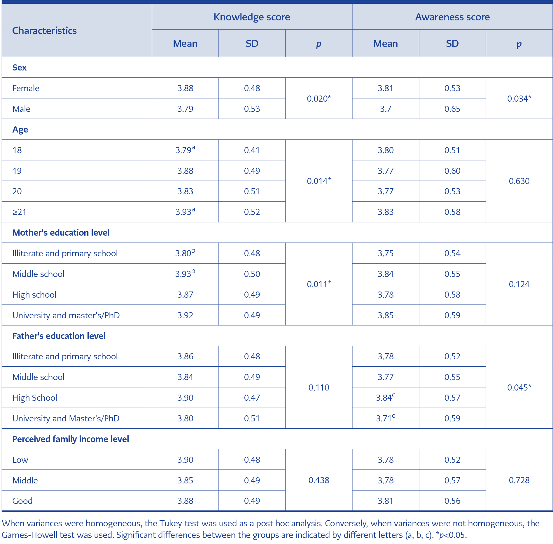 Table 2 presents participants’ Mpox knowledge and awareness levels according to basic characteristics. A significant difference was observed between genders, with women showing higher levels of both knowledge and awareness (p<0.05). Participants aged 21 and older also demonstrated higher levels of knowledge and awareness than those aged 18 (p<0.05). Regarding maternal education, participants whose mothers had completed middle school had significantly higher knowledge levels compared to those whose mothers were illiterate or primary school graduates (p<0.05). For paternal education, awareness levels were significantly higher among participants whose fathers were high school graduates compared to those whose fathers had completed university or postgraduate education (p<0.05). No significant differences were observed based on participants’ perceived family income.