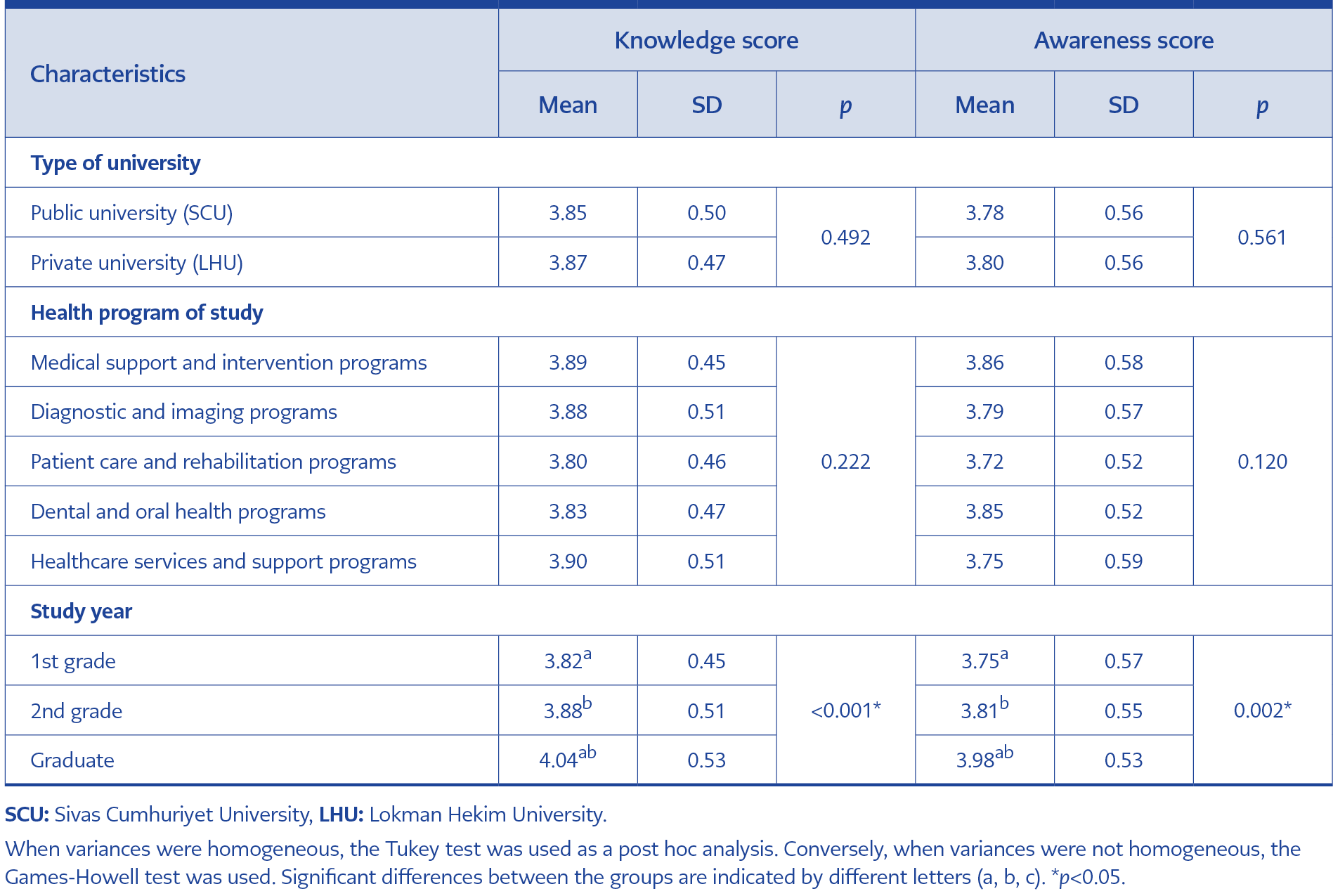 Table 3 shows participants’ knowledge and awareness levels by educational status. No significant differences were found between public and private university students or across different health programs. However, significant differences were observed by class level, with graduates demonstrating higher knowledge and awareness scores (p<0.05).