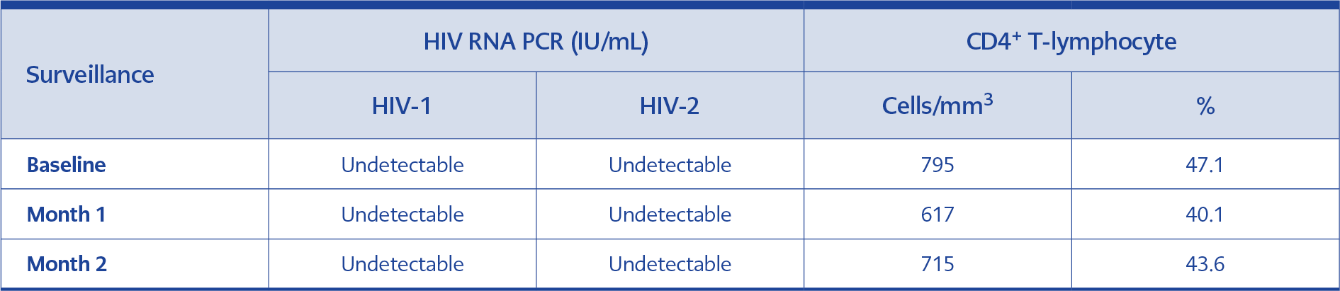 The patient, who was not receiving ART, had negative results for both HIV-1 RNA (NeuMoDx HIV-1 Quant Test; Qiagen, Hilden, Germany) and HIV-2 RNA (Vision HIV-2 Detection Kit; Vision Biotechnology, İstanbul, Türkiye). However, the result of the “in-house” HIV-2 proviral DNA analysis was reported as positive by the National Reference Laboratories in Ankara, Türkiye. The results of HIV-1 and HIV-2 PCR tests, CD4+ T-lymphocyte counts (Navios 10-color; Beckman Coulter, Brea, CA, USA), and percentages, which were screened at one-month intervals, are presented in Table 1. Physical examination and diagnostic testing revealed no evidence of comorbidity or coinfection during the follow-up period. Considering the possibility deportation, the initiation of ART was postponed to ensure that treatment would not be interrupted.