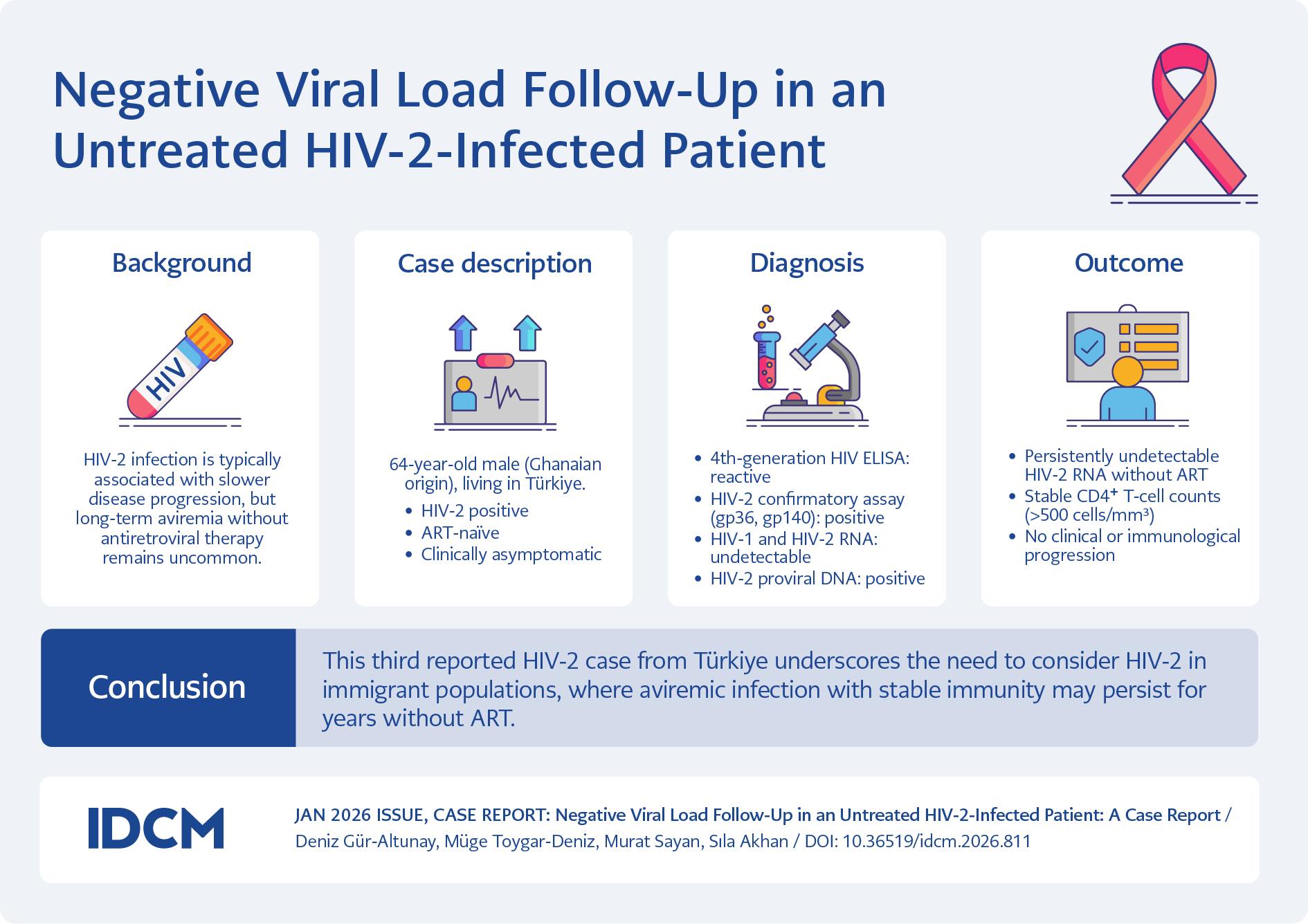A 64-year-old male patient of Ghanaian origin had lived in Canada until 10 years ago and had resided in Türkiye for the past 10 years. He was diagnosed with HIV-2 infection while living in Canada, but had never received antiretroviral treatment (ART). The patient has been imprisoned in Türkiye for the last several months and was brought to our clinic for a routine check-up.