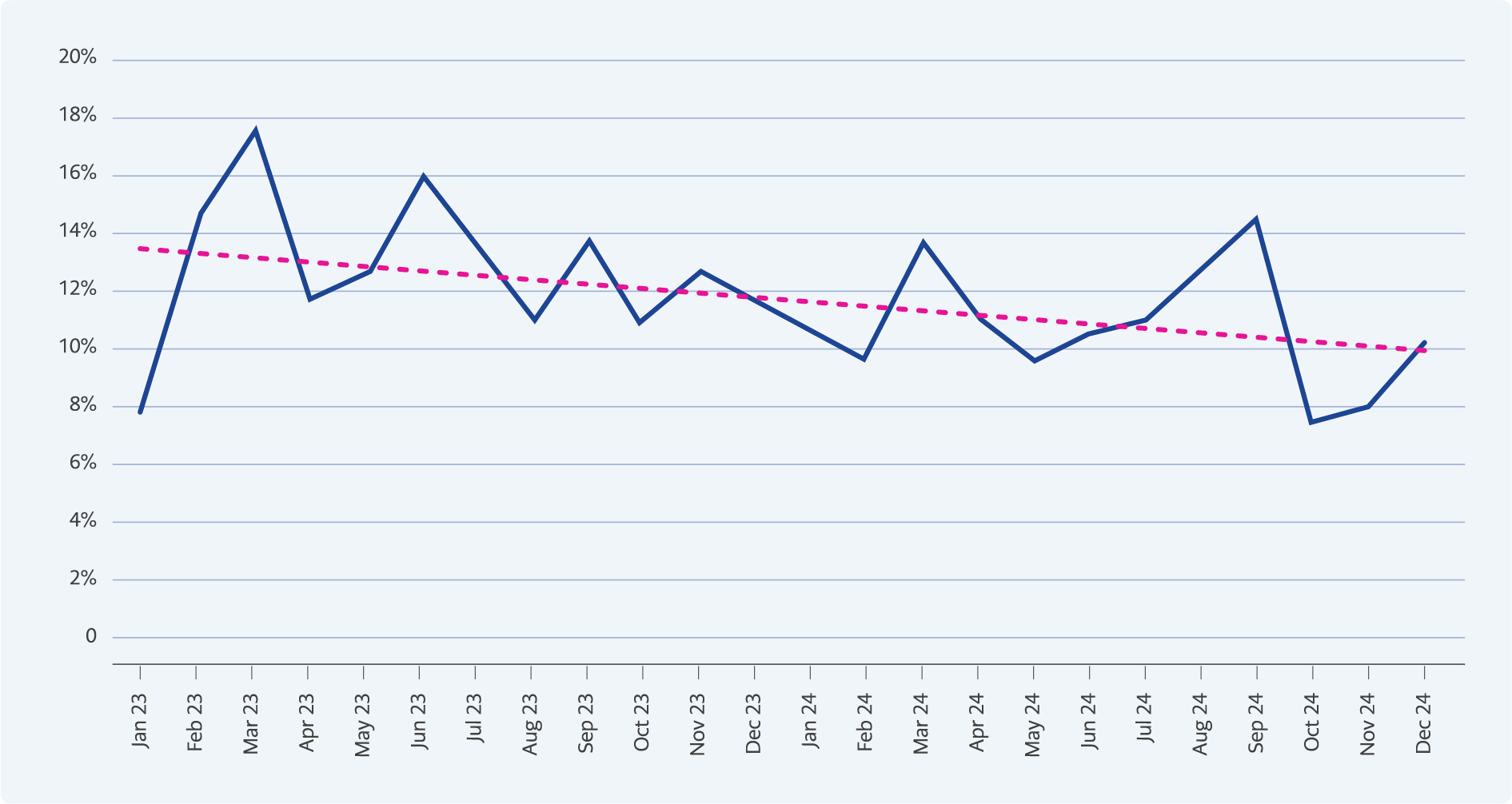 Simple linear regression analysis was performed to evaluate changes in monthly positivity rates, revealing a statistically significant decline over time (p<0.05) (Figure 1).