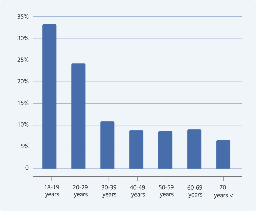 Analysis by age revealed a significant decrease in HPV positivity with increasing age, with the highest prevalence observed in the 18-19 age group (33.33% [6/18]; p<0.05) (Figure 2).