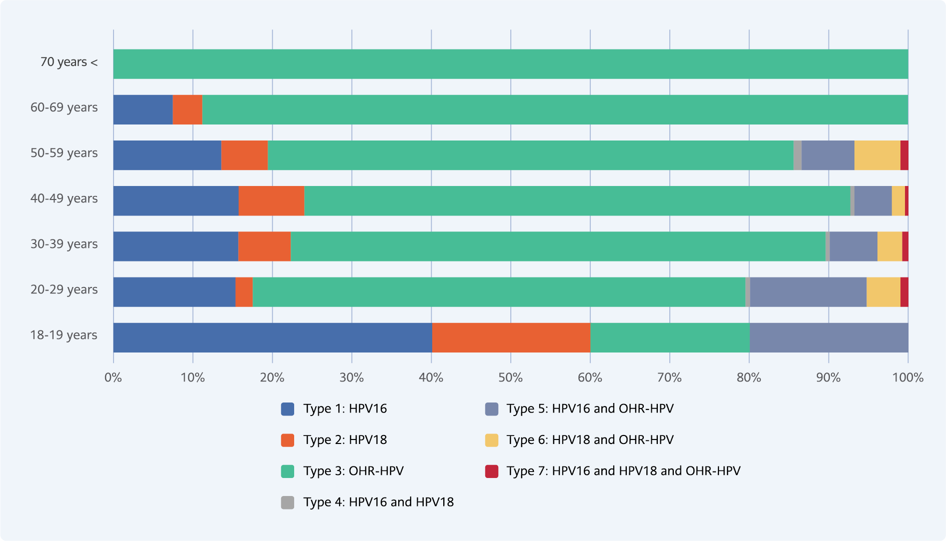 Regarding genotype distribution, HPV16 positivity was most frequently detected in the 18–19 age group, whereas OHR-HPV types were predominant in other age groups. However, no statistically significant association was observed between the distribution of HPV types and age group (p>0.05) (Figure 3).