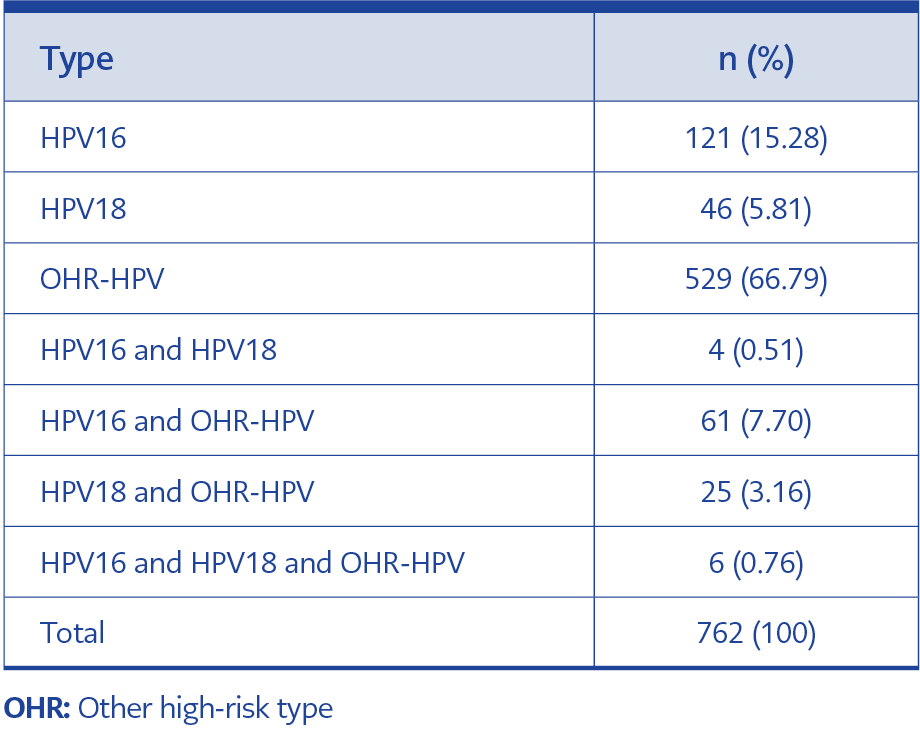 The mean age of patients with negative samples was 42.17 years (SD= ±9.72), while those with positive samples had a mean age of 38.59 years (SD= ±10.81). Table 1 presents the distribution of HPV types among positive cases. Only five patients complied with requests for repeat sampling; four of these had negative repeat results, and one had a positive result. Of the 27 patients asked to provide a repeat sample, 22 did not return for follow-up. Among the patients sampled, 220 were pregnant, with 28 (12.73% [28/220]) testing positive. A total of 66 patients who were initially pos-itive provided post-treatment follow-up samples; 57 (86.36% [57/66]) tested negative after treatment, while 9 (13.64% [9/66]) remained positive. The mean time between the initial and follow-up samples was 330 days, 8 hours, 56 minutes (SD= ±125 days, 23 hours, 27 minutes).