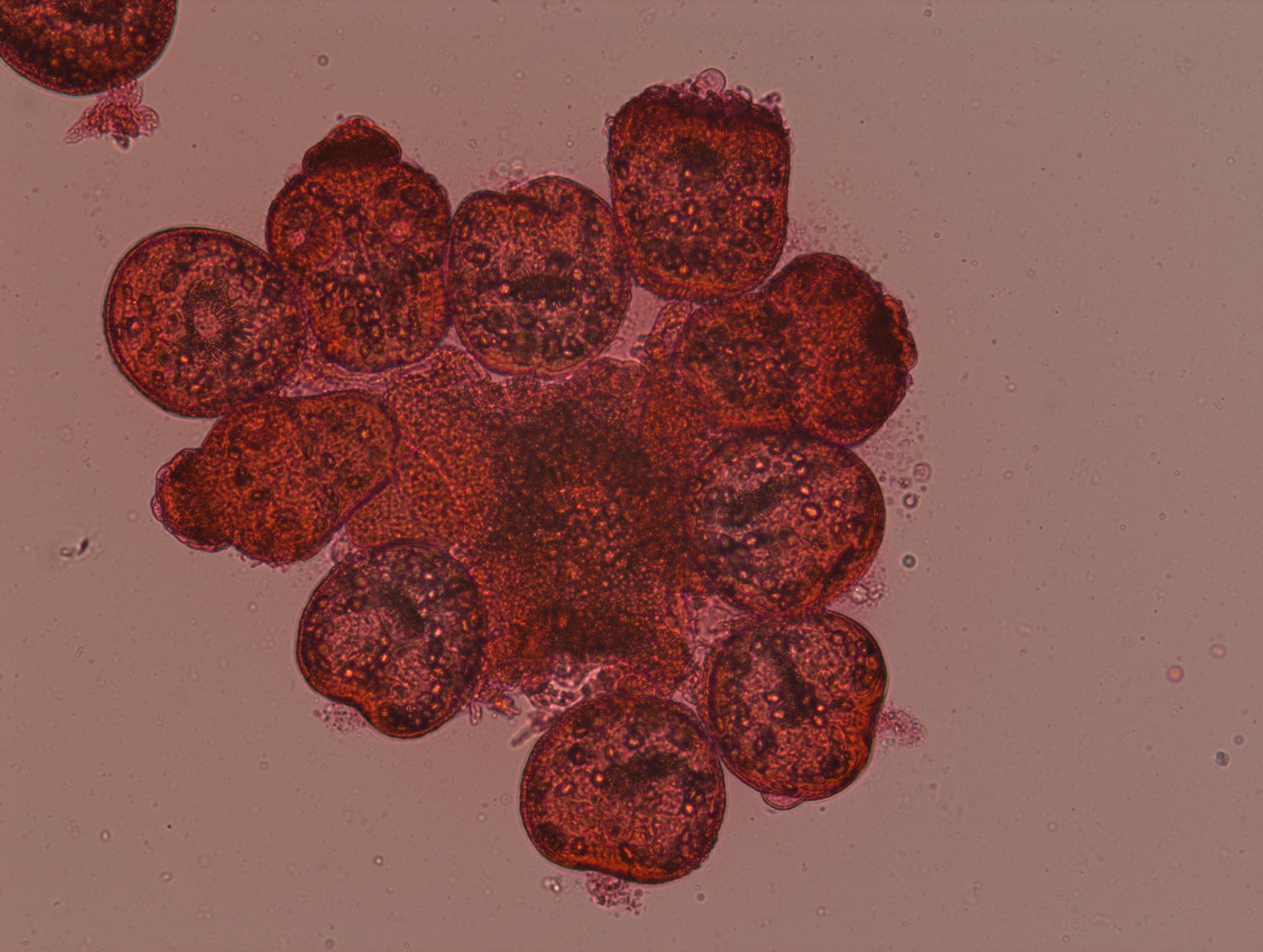 Livers with cysts from sheep were obtained from a local slaughterhouse in Çanakkale province, Turkey. Aseptic methods were used to collect hydatid fluid in sterile tubes. The supernatant was removed after the protoscoleces were sedimented and formed hydatid sand. The obtained suspension had 4000±100 protoscoleces/mL, and viability was 95%. A microbiologist with 25 years of experience in parasitology evaluated viability by flame cell motility and 0.1% eosin dye exclusion test using a light microscope at X40 magnification. Live protoscoleces excluded the eosin dye (Figure 1), were colorless, and had flame cell activity, while dead protoscoleces had no flame cell activity and were colored red (Figure 2).