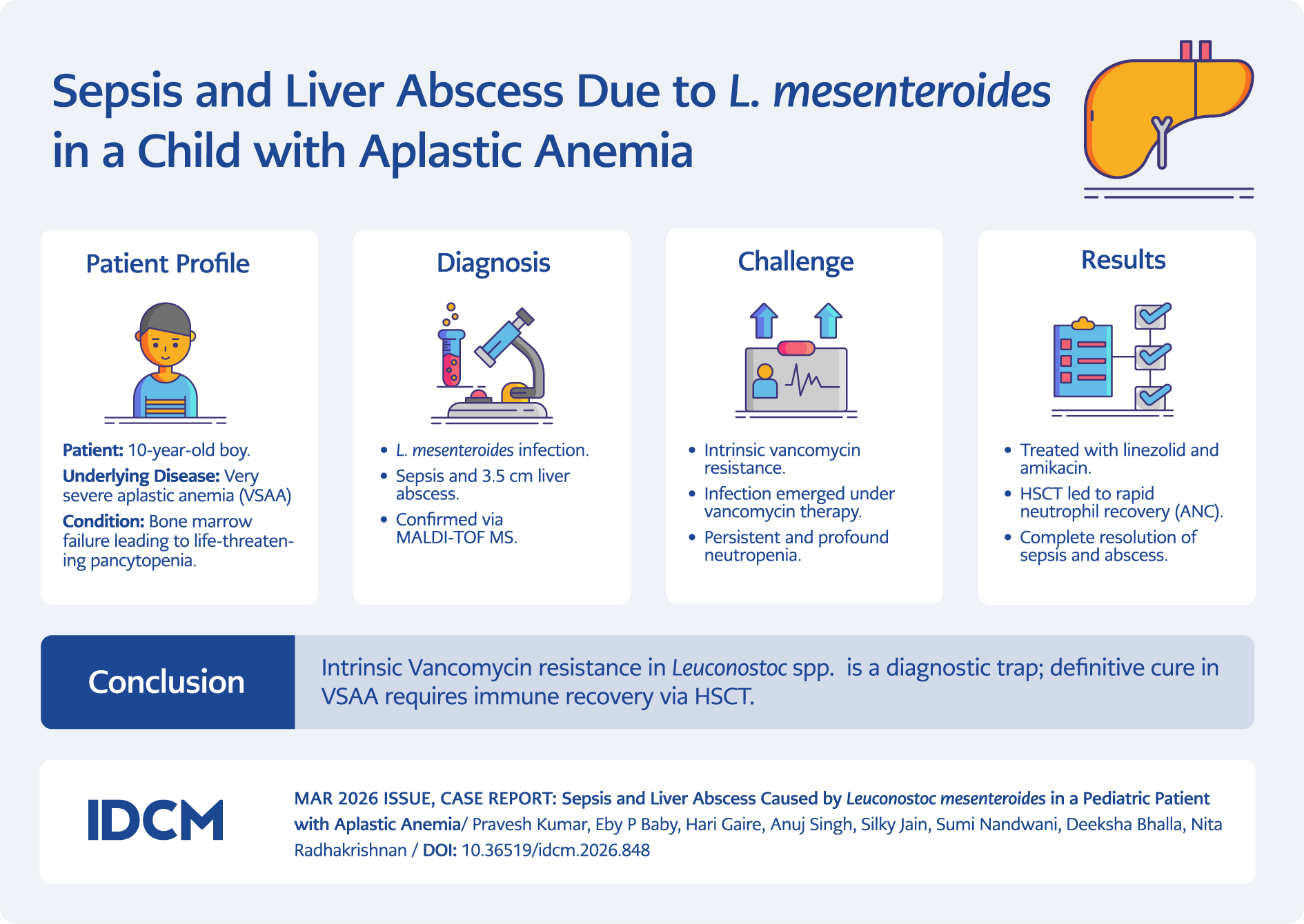Leuconostoc spp. are uncommon but increasingly recognized causes of invasive infections in vulnerable patients. Our case of L. mesenteroides bacteremia complicated by liver abscess in a child with very severe aplastic anemia illustrates several important features noted in previous reports: the organism’s intrinsic resistance to glycopeptides leading to potential therapeutic failure if misidentified, its predilection for immunocompromised hosts with disrupted mucosal barriers or profound neutropenia, and the central role of host immune recovery in achieving durable clearance of infection.