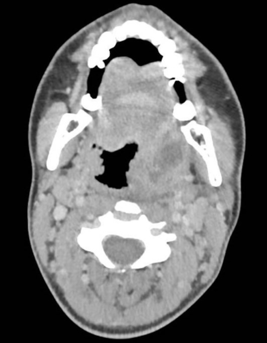 A 27-year-old previously healthy female was referred to our tertiary care center from a local clinic with a diagnosis of a left peritonsillar abscess confirmed by computed tomography (CT) (Figure 1). She reported a two-week history of odynophagia, which had started two weeks after a sexual encounter. Her symptoms have worsened over the last three days, with the onset of a dysphonia and trismus.