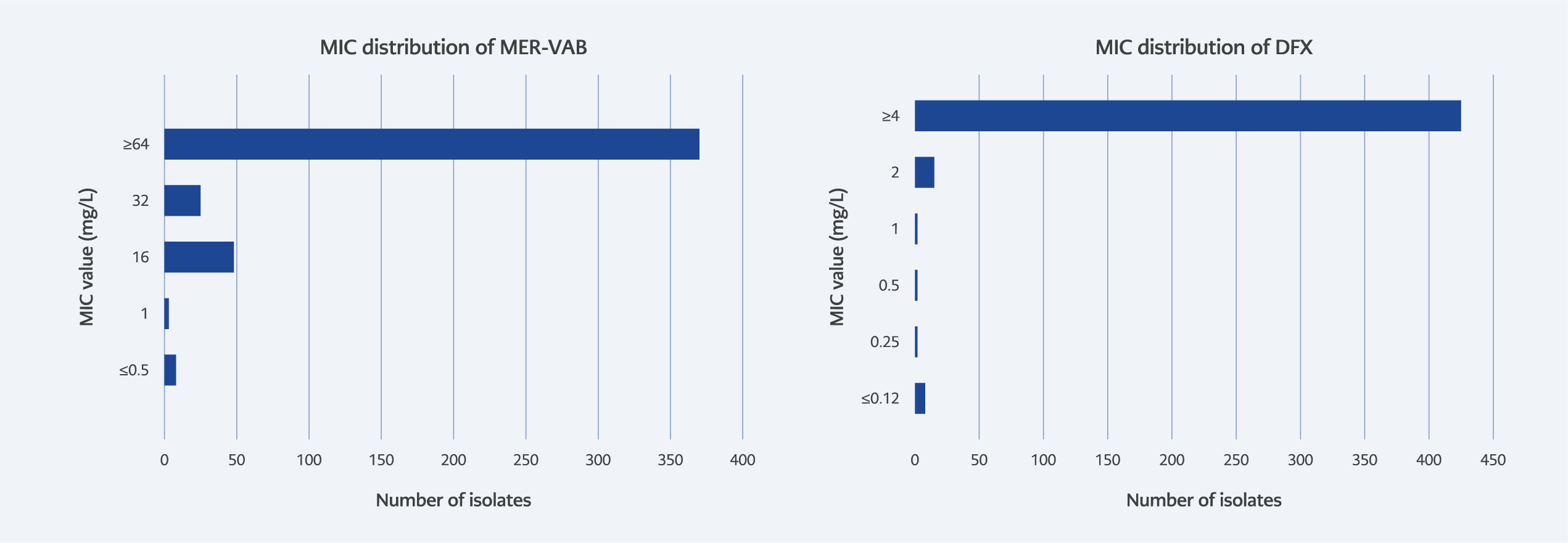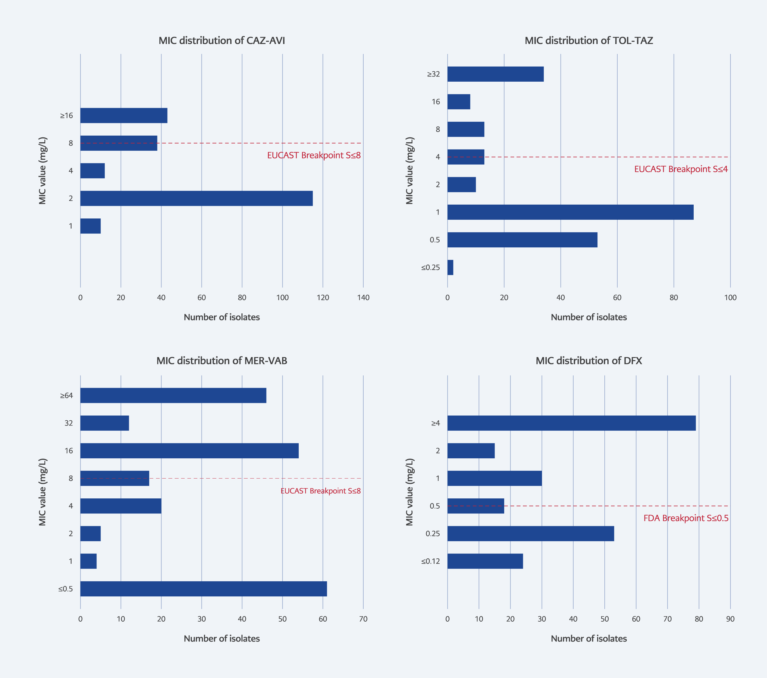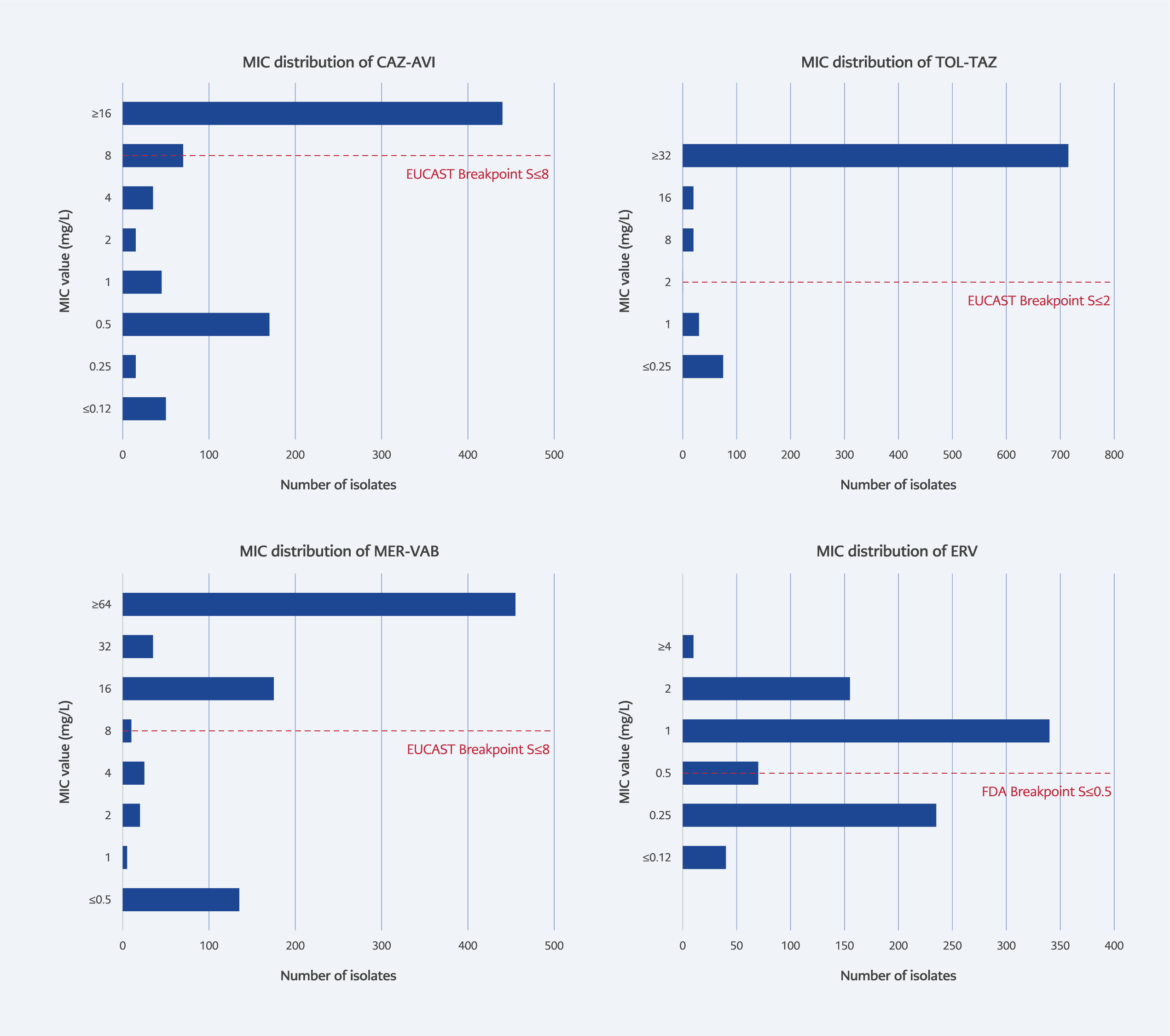 Resistance rates for P. aeruginosa were 20.1% for CAZ-AVI, 25.1% for TOL-TAZ, and 51.1% for MER-VAB. The MIC distribution of the novel antibiotics against P. aeruginosa isolates is shown in Figure 2.