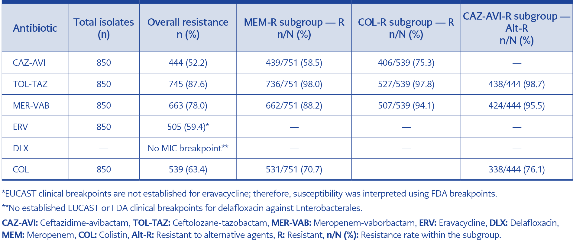 Bacterial isolates obtained from ICU patients were identified using the VITEK® 2 automated system (bioMérieux, Marcy-l’Étoile, France) and the VITEK® MS (bioMérieux, Marcy-l’Étoile, France). Susceptibility testing for TOL-TAZ, CAZ-AVI, MER-VAB, ERV, and DLX was performed on isolates identified as K. pneumoniae, A. baumannii, and P. aeruginosa using the VITEK® 2 automated system (bioMérieux, Marcy-l’Étoile, France) with the XN21 card. Colistin susceptibility was determined by broth microdilution. Minimum inhibitory concentration (MIC) values and susceptibility categories for the tested antibiotics were interpreted according to the European Committee on Antimicrobial Susceptibility Testing (EUCAST) guidelines (10). Since specific EUCAST breakpoints are currently undefined for ERV and DLX for certain species, susceptibility for these agents was interpreted based on the U.S. Food and Drug Administration (FDA) breakpoints to ensure accurate categorization. Quality control was performed using standard reference strains, including Escherichia coli ATCC 25922, P. aeruginosa ATCC 27853, and Enterobacter hormaechei ATCC 700323, in accordance with EUCAST recommendations.