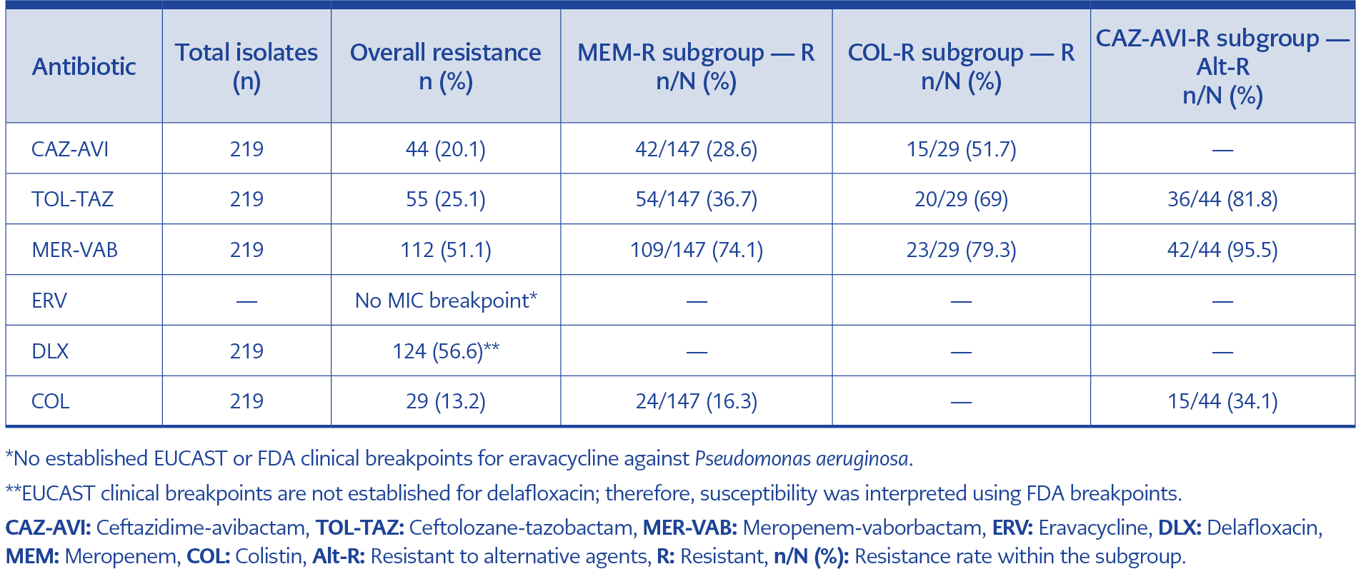 In conclusion, our findings indicate that the in vitro activity of several novel antibiotics against resistant Gram-negative pathogens in Türkiye is limited. High resistance rates were observed for CAZ-AVI and MER-VAB among K. pneumoniae isolates, whereas TOL-TAZ and delafloxacin retained partial activity against P. aeruginosa. Among A. baumannii isolates, available treatment options were largely ineffective. These findings emphasize that antibiotic stewardship strategies should integrate local resistance data alongside pharmacological properties to guide effective therapy. Ultimately, integrating phenotypic and molecular data is crucial for continuous national surveillance to preserve the efficacy of novel antibiotics.