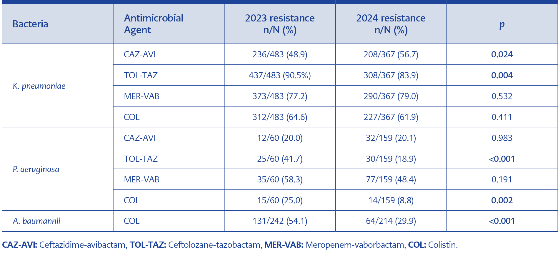 Among meropenem-resistant P. aeruginosa isolates, COL (83.7%) and CAZ-AVI (71.4%) exhibited high susceptibility rates (Table 2). For COL-resistant isolates, nearly half (48.3%) remained susceptible to CAZ-AVI. In contrast to K. pneumoniae, COL retained substantial activity (65.9%) against CAZ-AVI-resistant P. aeruginosa strains. Resistance to COL and TOL-TAZ decreased significantly in 2024 compared to 2023 (p=0.002 and p<0.001, respectively) (Table 3).