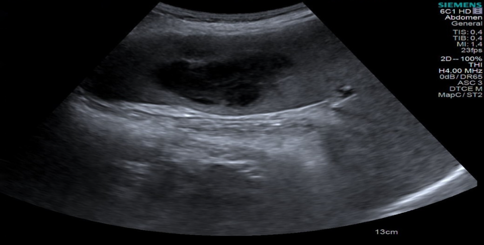 Abdominal ultrasonography identified a heterogeneous 60×45 mm abscess with a hypoechoic centre in an enlarged spleen and multiple small cystic lesions in the liver (Figure 1). Splenic abscess drained through a needle aspiration with temporary drainage catheter and several samples collected for microbiological examination; however, no sample was available for histopathological evaluation. Then, piperacillin-tazobactam 4.5 g every 6 hours was given empirically.