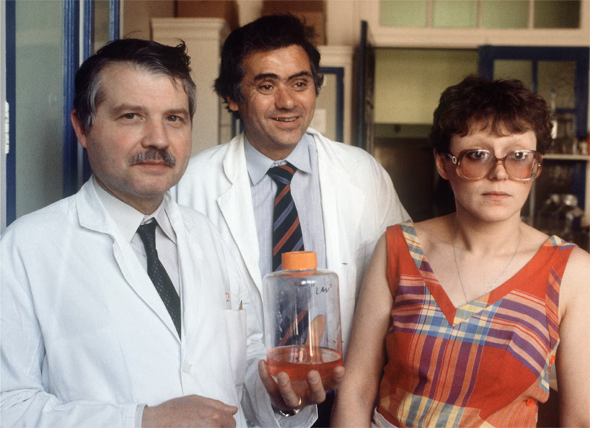Photograph. Luc Montagnier (left), Jean-Claude Chermann (center), and Françoise Barré-Sinoussi with a jar containing the lymphadenopathy-associated virus, 1984.