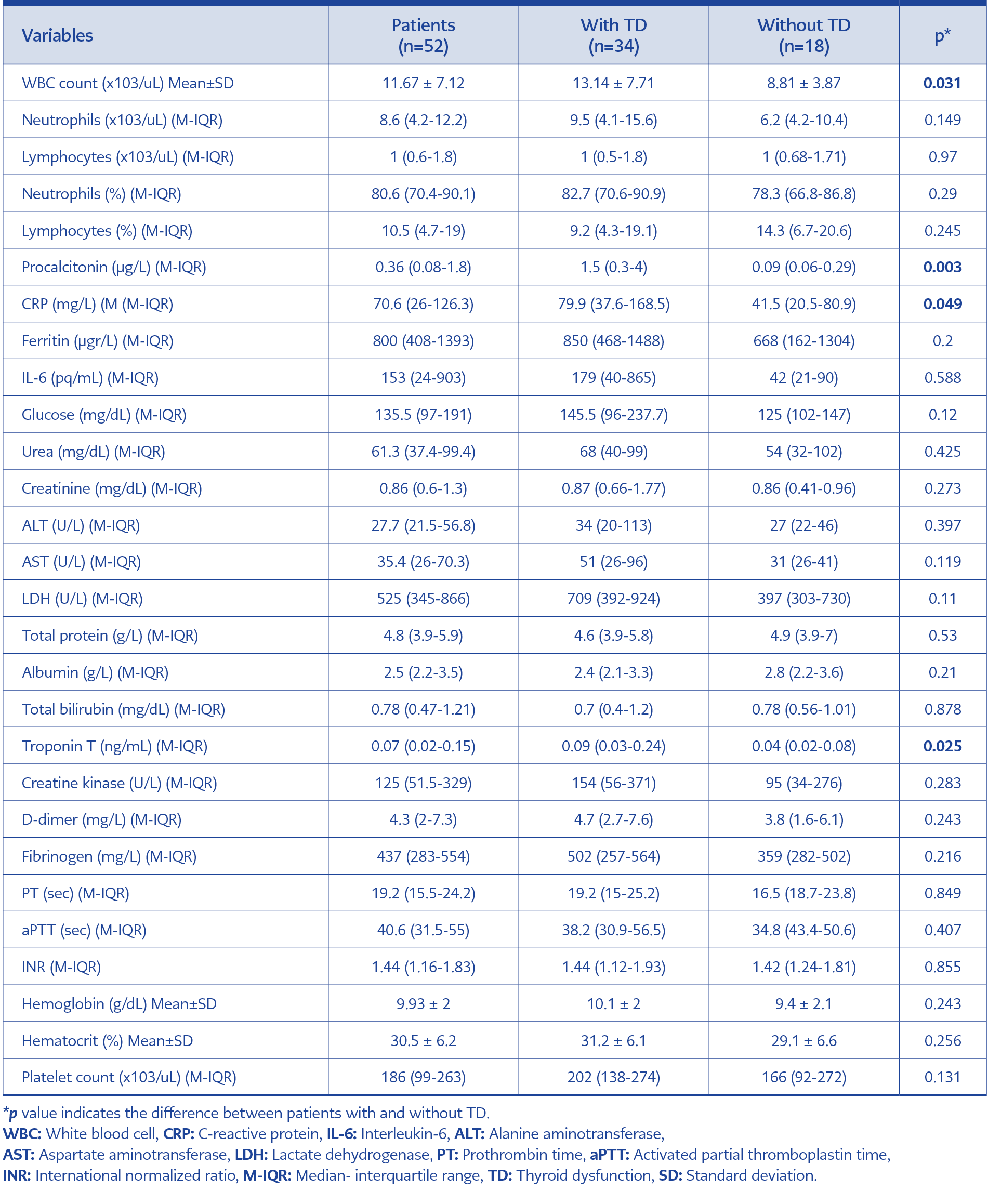 This study aimed to evaluate the frequency of thyroid dysfunction (TD) in patients admitted to the intensive care unit (ICU) with critical COVID-19, together with inflammatory markers and disease severity.