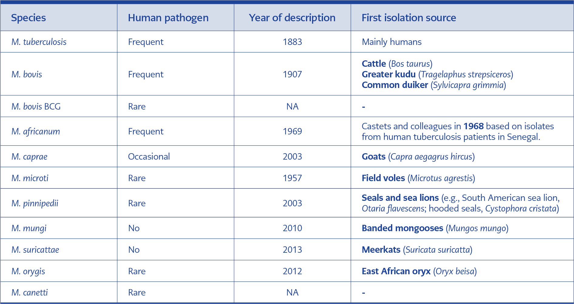 Table 1. Summary of the known MTBC members, their pathogenicity in humans, first isolation sources, and key differentiating features (adapted from reference 11).