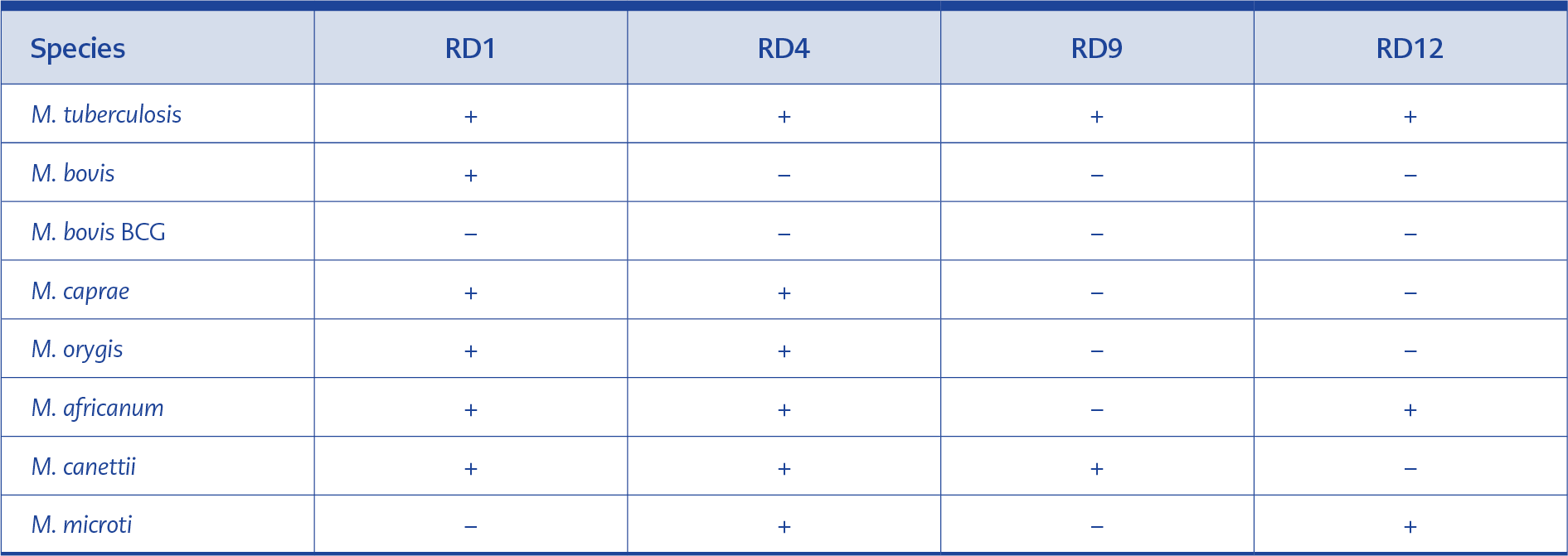 Table 2. Region-of-difference (RD) presence/absence signatures commonly used to differentiate members of the M. tuberculosis complex (RD1, RD4, RD9, RD12). Presence (+) and absence (−) patterns shown are the expected signatures for typical representatives of each species; exceptions and atypical RD sizes occur (adapted from reference 1).